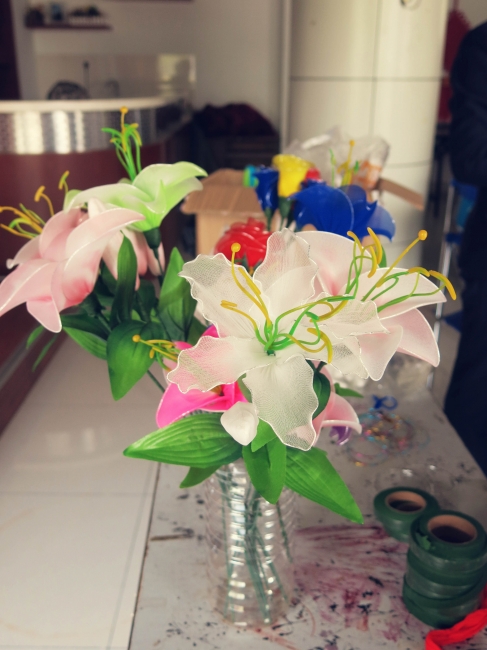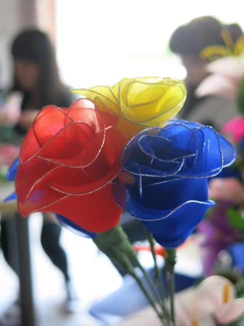 同学们依次领取了材料后,便围坐在阿姨身边,听着阿姨们细致的讲解与演示。阿姨用娴熟的手法摆弄着手中钢丝,很快钢丝便在阿姨的巧手下围成一片花瓣的形状,在套上一块色彩绚丽的丝袜,经过一些微调后,一片鲜活的花瓣就呈现在阿姨的手中。